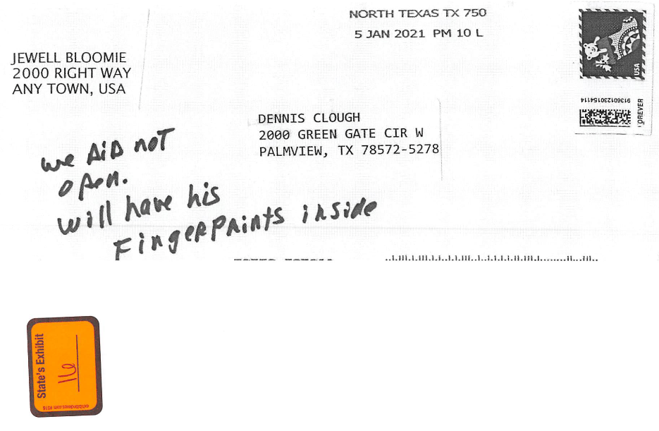 A single envelope was selected to remain unopened. In testimony she distinctly recalled that they probably opened it later, at some point, but didn’t remember what might have been in it. Never a word about why they wanted finger prints.